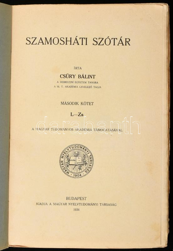Csűry Bálint: Szamosháti szótár I-II. köt. I. köt.: A-K. II. köt.: L-Zs. Bp., 1935-1936, Magyar Nyelvtudományi Társaság, 572+1 p.; 480 p. Kiadói papírkötés, kissé foltos borítóval és lapokkal, a II. kötet gerince foltos, fölöspéldány bélyegzésekkel. Klemm Antal (1883 - 1963) nyelvész, finnugrista, bencés szerzetes névbejegyzéseivel.