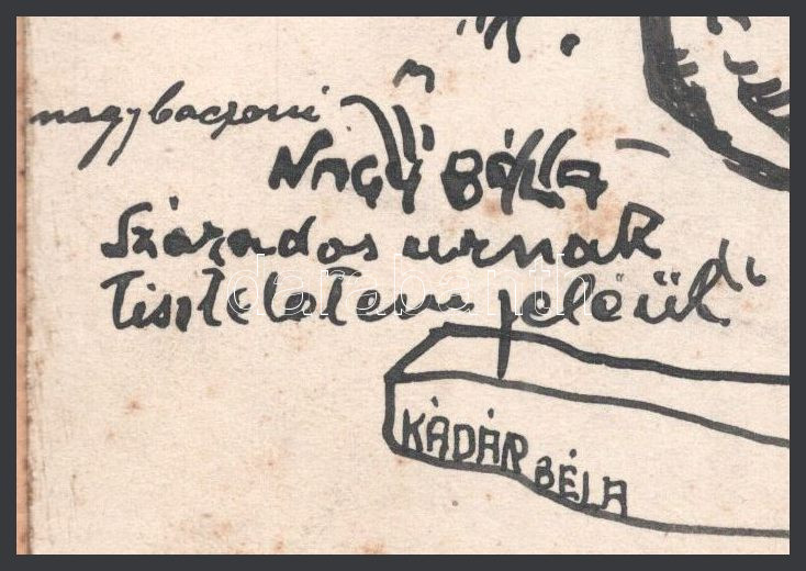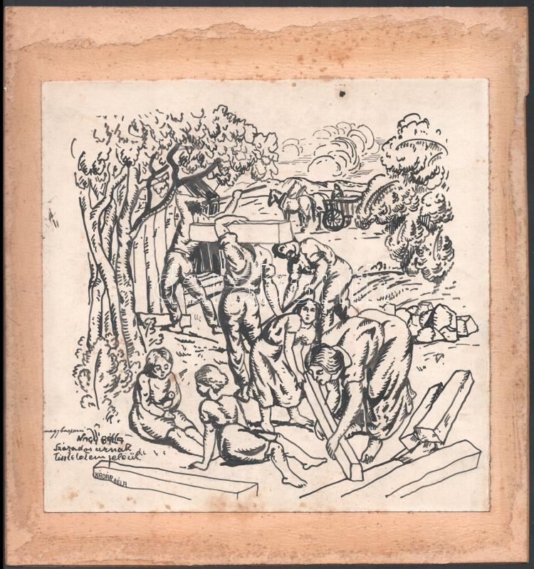 Kádár Béla (1877-1956): Falusi jelenet. Tus, papír, jelzett. Nagy Béla (1882-1962) százados, későbbi altábornagy részére dedikált, Kádár Béla autográf ajándékozási soraival. Kartonra ragasztva, foltos, 24,5×24,5 cm / ink on paper, signed, with Béla Kádár's autograph dedication lines