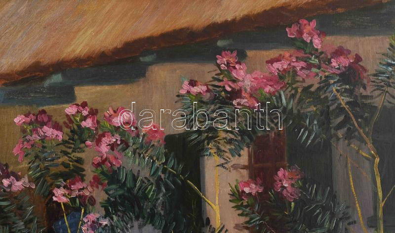Pap Emil (1884-1955): Virágos udvar. Olaj, vászon, jelzett. Dekoratív fakeretben, 65x101 cm / oil on canvas, signed, framed. KIZÁRÓLAG SZEMÉLYES ÁTVÉTEL, NEM POSTÁZZUK! / ONLY PERSONAL COLLECTION AT OUR OFFICE!