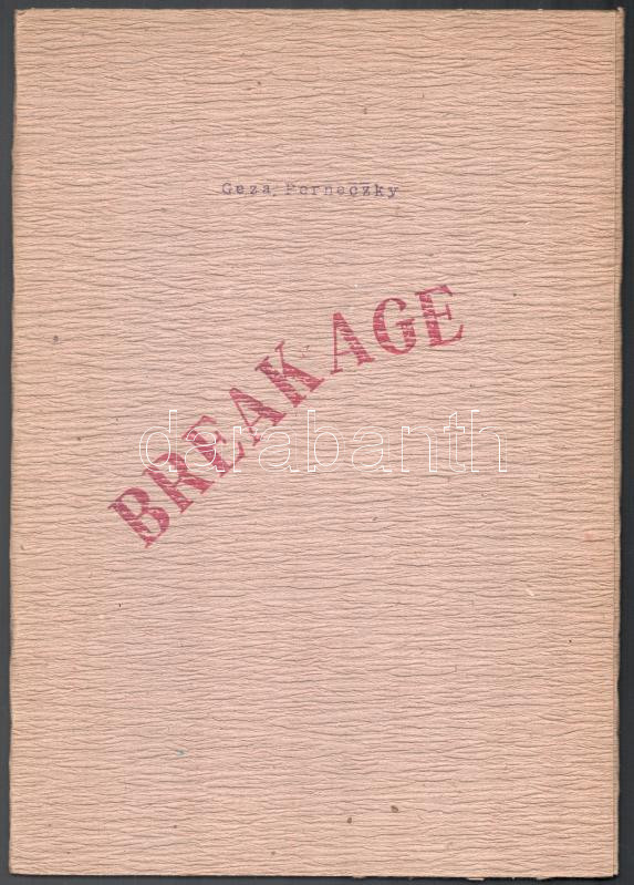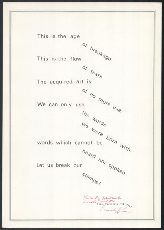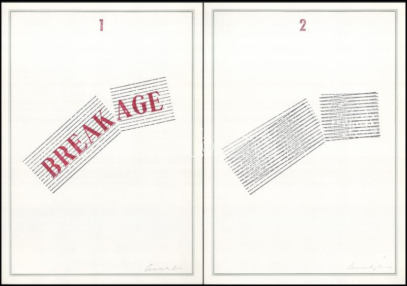 1982 Géza Perneczky: Breakage. A művész, Perneczky Géza (1936-) Széchenyi-díjas művészettörténész, képző-, festőművész, író által Haraszty István "Édeskének" (1934-2022), Kossuth-díjas szobrász, festőművész és felesége részére DEDIKÁLT példány. hn, 1982, nyn., 1+8 t. A 8 tábla ceruzával jelzett. Kiadói papírmappában. Ritka neoavantgárd kiadvány!