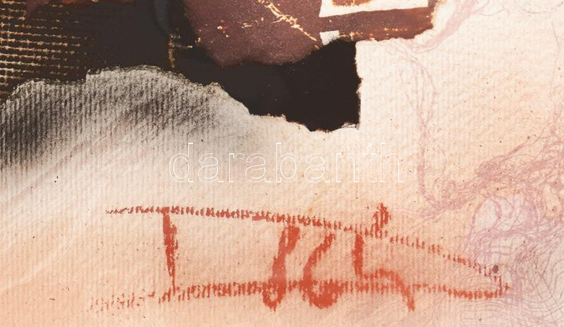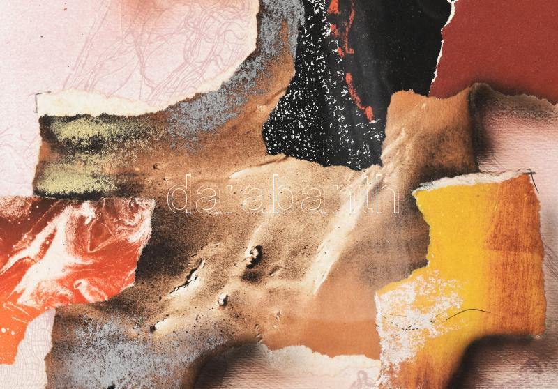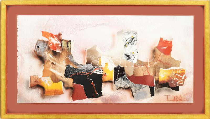 Dús László (1941-): Színek játéka (cím nélkül), 1986. Vegyes technika, kollázs, papír, jelezve jobbra lent, 32,5×53 cm / László Dús (1941-): Untitled, 1986. Mixed technique and collage on paper, signed, framed, 32,5×53 cm.