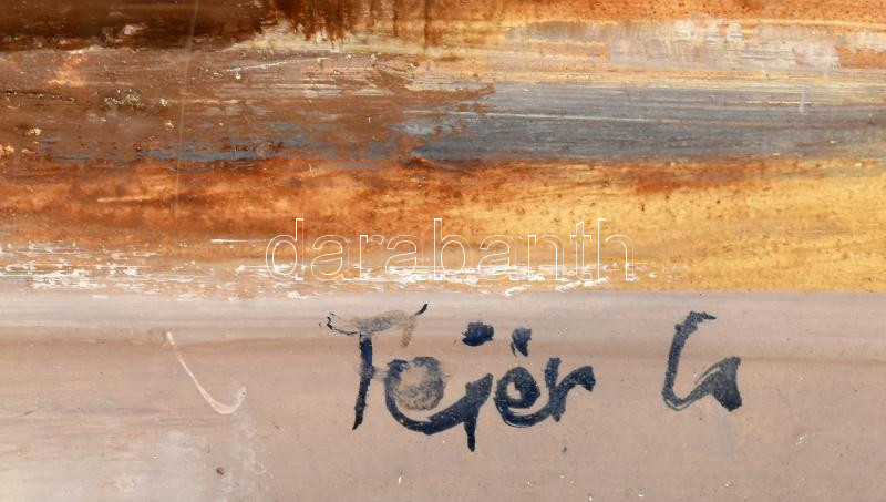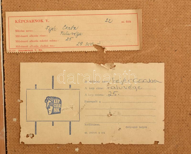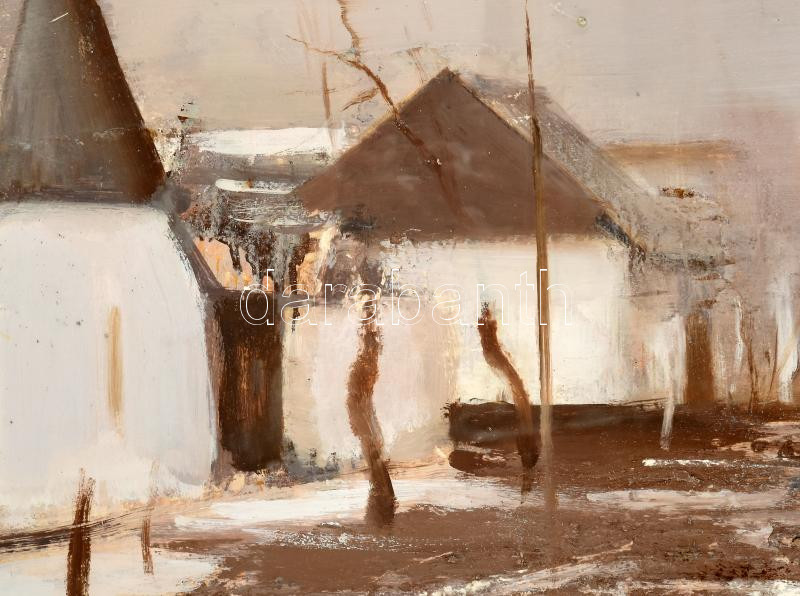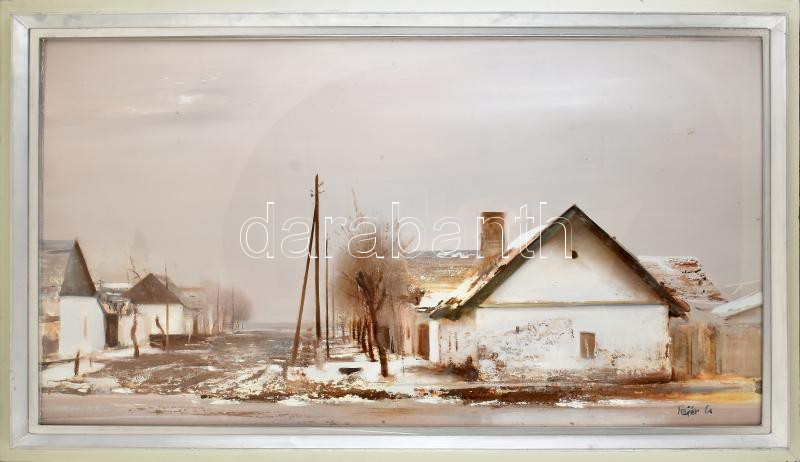 Fejér Csaba (1936-2002): Faluvége. Olaj, farost, jelzett, hátoldalán Képcsarnok Vállalat címkéivel. 60x110 cm Üvegezett fakeretben. KIZÁRÓLAG SZEMÉLYES ÁTVÉTEL, NEM POSTÁZZUK! / oil on wood fibre, signed, framed. ONLY PERSONAL COLLECTION AT OUR OFFICE!