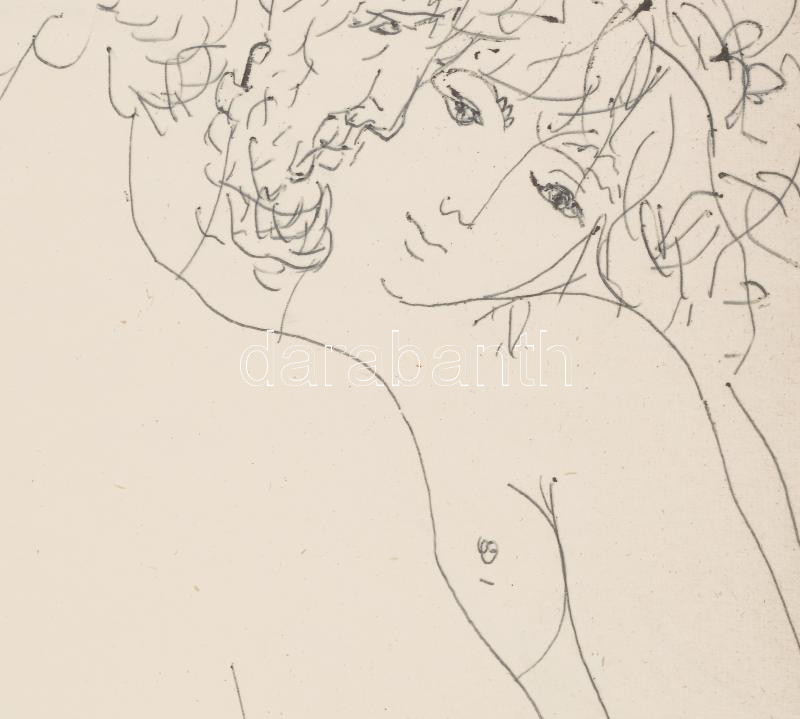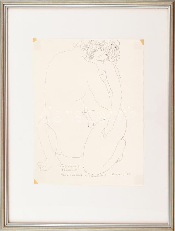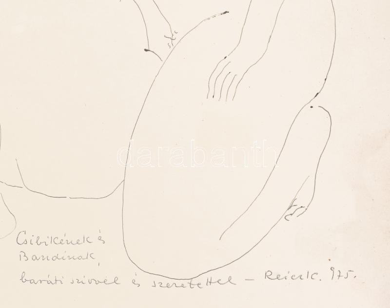 Reich Károly (1922-1986): Szerelmesek. Toll, papír, jelzett, Reich Károly autográf ajándékozási soraival Ury Ibolya (1924-2009), a Műcsarnok tudományos főmunkatársa és férje részére 1975-ből. 29x23 cm keretben / pen on paper, signed, with autograph deication lines to art historian Ibolya Ury, framed