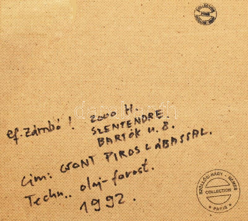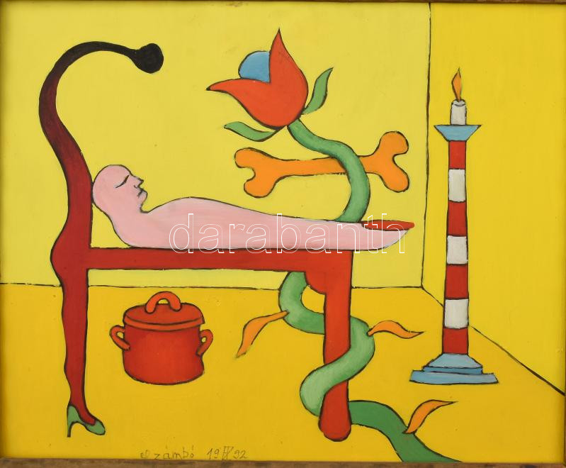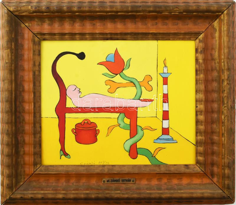 ef.Zámbó (efZámbó) István (1950-): Csont piros lábossal, 1992. Olaj, farost, jelezve középen lent, hátoldalán ef.Zámbó István autográf feliratával és Szöllősi-Nagy-Nemes gyűjtemény bélyegzőjével. Fakeretben. 24×29,5 cm / oil on fibre board, signed, with the artist's autograph description on the and Szöllősi-Nagy-Nemes collection stamp on the reverse