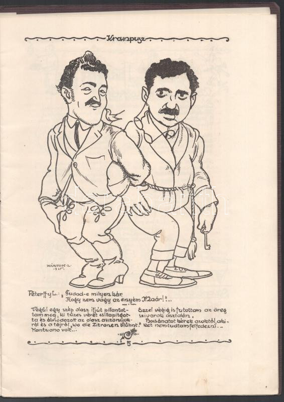 1925 Krampusz. V. évfolyam. 1925. jubileumi szám. [A Budai Szent Imre Kollégium diákjainak humoros folyóirata. Megjelenik évente.] [Bp.], 1925., nyn., 27+1 p. Szövegközti humoros rajzokkal, karikatúrákkal gazdagon illusztrált, közte Márton Lajos grafikus munkájával is. Papírkötés, laza fűzéssel, de ettől eltekintve jó állapotban.