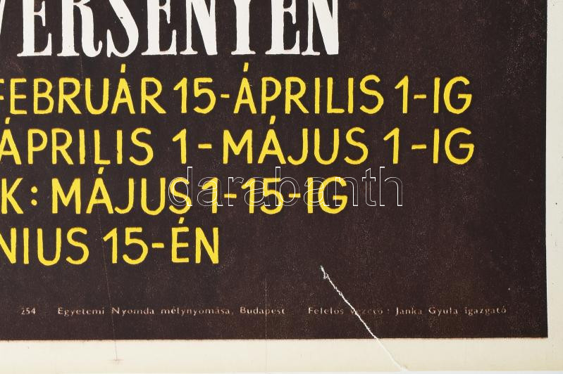 Beschreibung: cca 1950 Fiatalok! Vegyetek részt az Ifjúsági Céllövő versenyen..., plakát, Sebők grafikája, kiadja: Egyetemi Nyomda, hajtott, szakadással, 57×41 cm