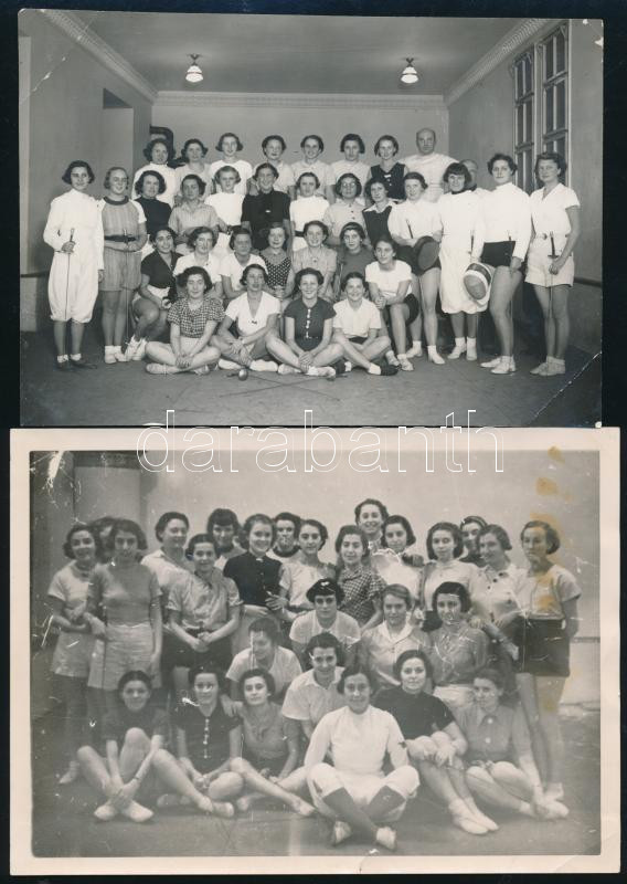 1927-1936 Női vívófotók, 4 db, közte 1 db: Fodor iskolában BHVC 1927, valamint a női vívó utánpótlás 3 db fotója (1936), az egyik fotó sarkain törés- és kopásnyomokkal, egy másik fotón szakadással, ez utóbbi sérült fotóról történt későbbi előhívás, 13x18 cm és 9x13 cm közötti méretben