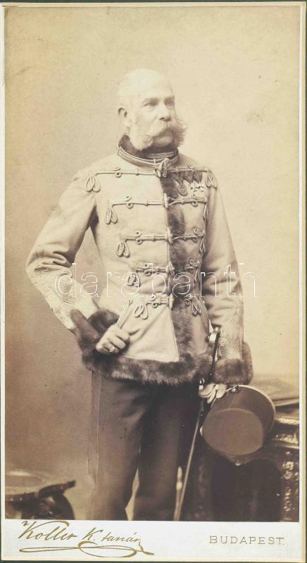 cca 1890-1900 I. Ferenc József (1830-1916) osztrák császár, magyar és cseh király portréfotója, Koller K(ároly) tanár budapesti műterméből, paszpartuban, üvegezett fa keretben, (körbevágott?), a felületén apró foltokkal, 20x10,5 cm, keret: 31x22 cm