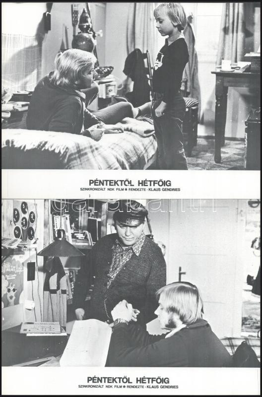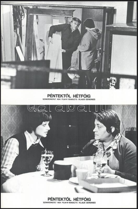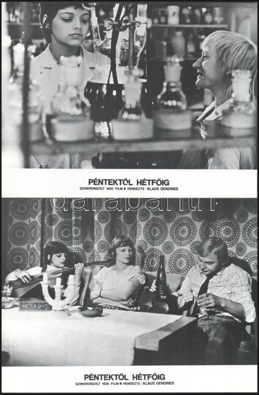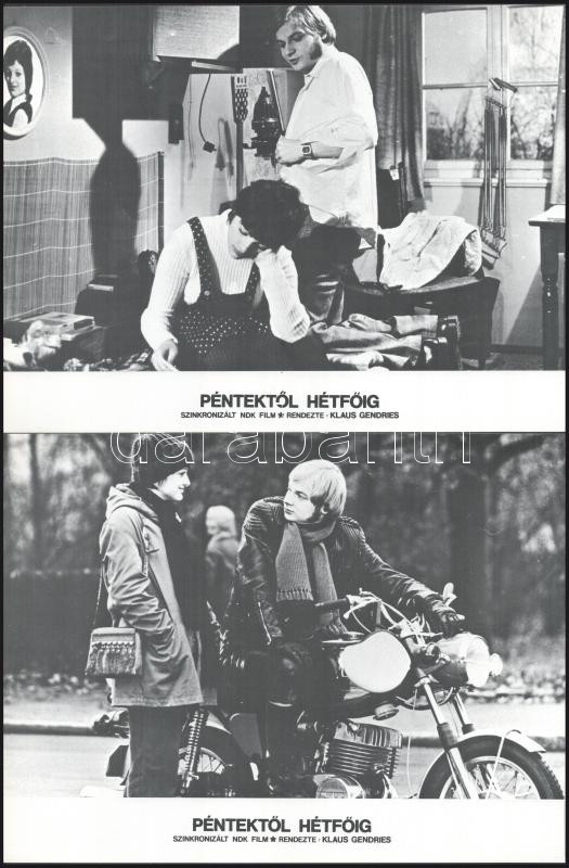cca 1975 ,,Péntektől hétfőig" című NDK-beli film jelenetei és szereplői, 8 db produkciós filmfotó nyomdatechnikával sokszorosítva kartonpapírra (nyomat), egyoldalas nyomással, a használatból eredő (esetleges) kisebb hibákkal, 18x24 cm