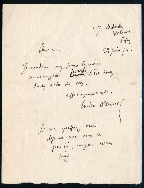 1874 Émile Ollivier (1825-1913) francia miniszterelnök, Liszt Ferenc vejének autográf levele / Autoraph letter of Émile Olivier (1825-1913) prime minister of France and son in law of Franz Liszt
