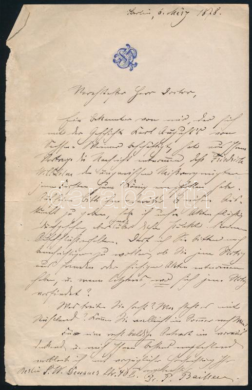 1878 Paul Bailleu (1853-1922) német történész és levéltáros saját kézzel írt levele Marczali Henrik (1856-1940) történész részére, német nyelven, 1 beírt oldal, kis szakadással. /