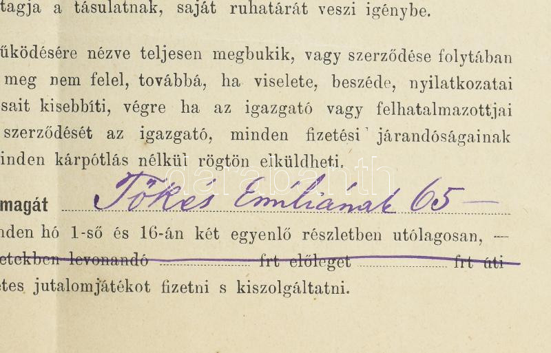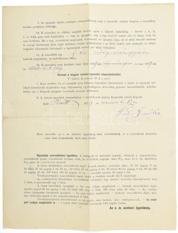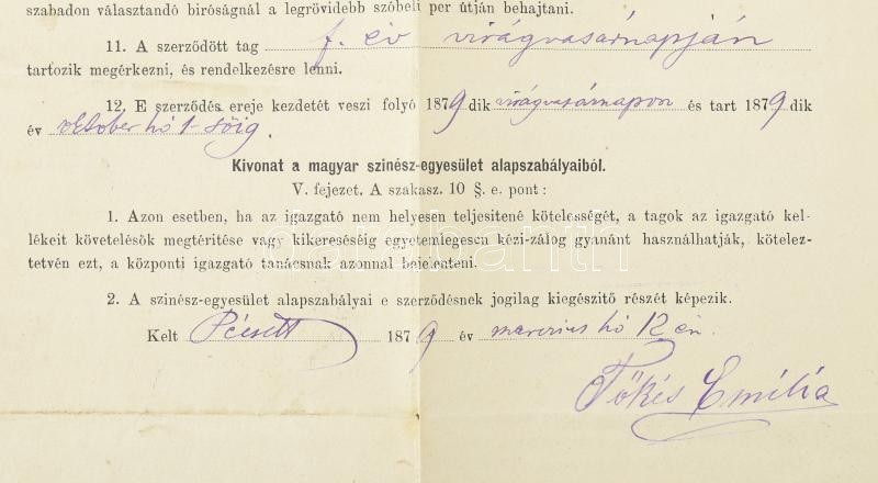 1879 Tőkés Emília (1835-1911) színésznő, az 1860-as évek egyik legismertebb, legkedveltebb vidéki színésznőjének pécsi színházi szerződése, autográf aláírásával, 1879. március. 12., hajtásnyommal.