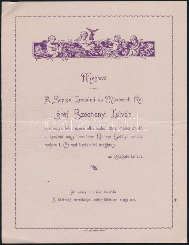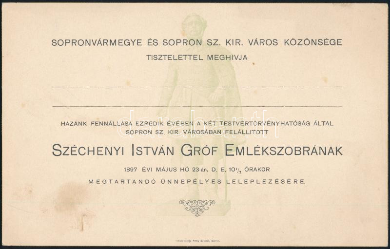 1897 Sopronvármegye és Sopron Sz. Kir. Város Közönsége Széchényi István gróf emlékszobrának ünnepélyes leleplezésének meghívója, 1897. május hó. 23., név nélkül, 15x24 cm + Meghívó a Soproni Irodalmi és Művészeti Kör gróf Széchenyi István szobrának leleplezése alkalmából 1897. május 23-án a kaszinó nagytermében Ünnepi Estélyt rendez, melyre t. Czimet tisztelettel meghívja..., 2 sztl. lev.