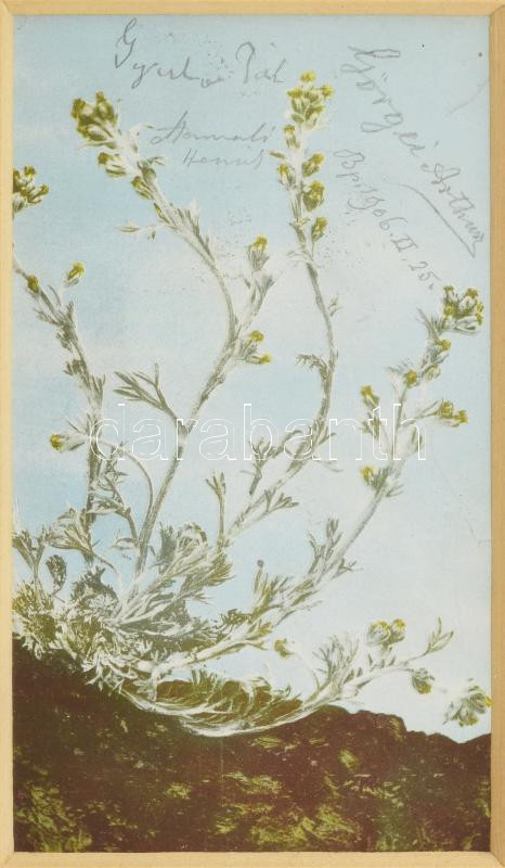 1906 Görgei Artúr (1818-1916) honvédtábornok és Gyulai Pál (1826-1909) irodalomtörténész, költő, író aláírásai képeslapon, dátumozva (Bp., 1906. II. 25.), paszpartuban, üvegezett keretben, 22x17 cm, paszpartu: 13,5x8 cm