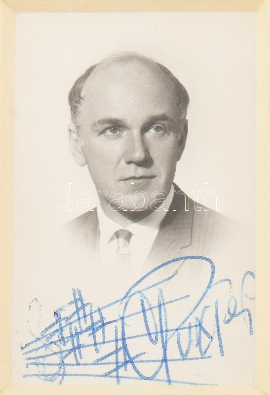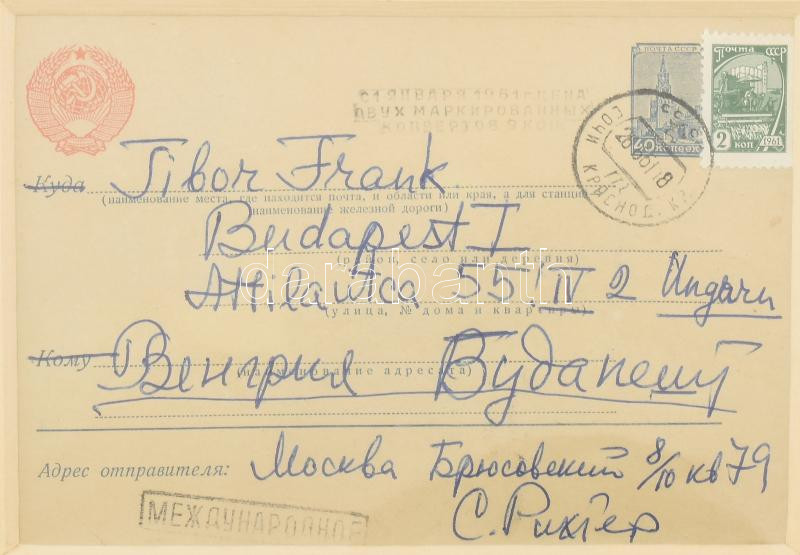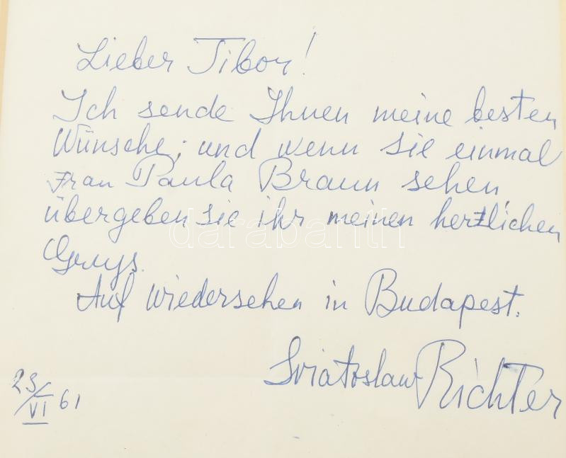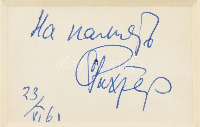 1961 Szvjatoszlav Richter (1915-1995) világhírű szovjet zongoraművész autográf, német nyelvű levele, borítékkal, őt ábrázoló kisméretű dedikált képpel. Üvegezett keretben, kétoldalas paszpartuban, 37x45 cm./ 1961 Autograph letter of the world famous pianist Sviatoslav Richter (1901-1995.) In German language, with signed picture, with envelope, in double side matboard, in a glazed frame, 37x45 cm
