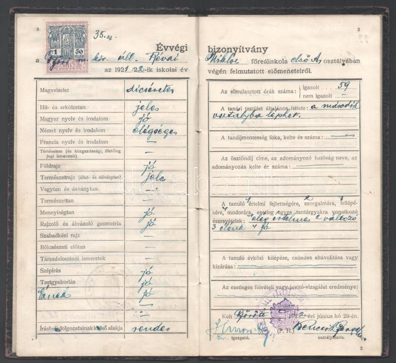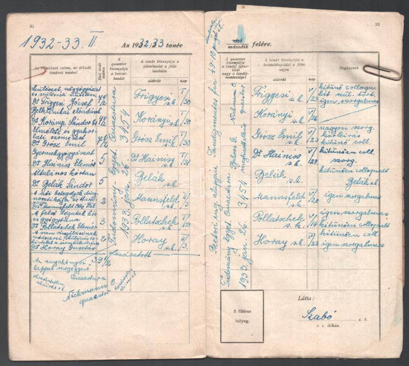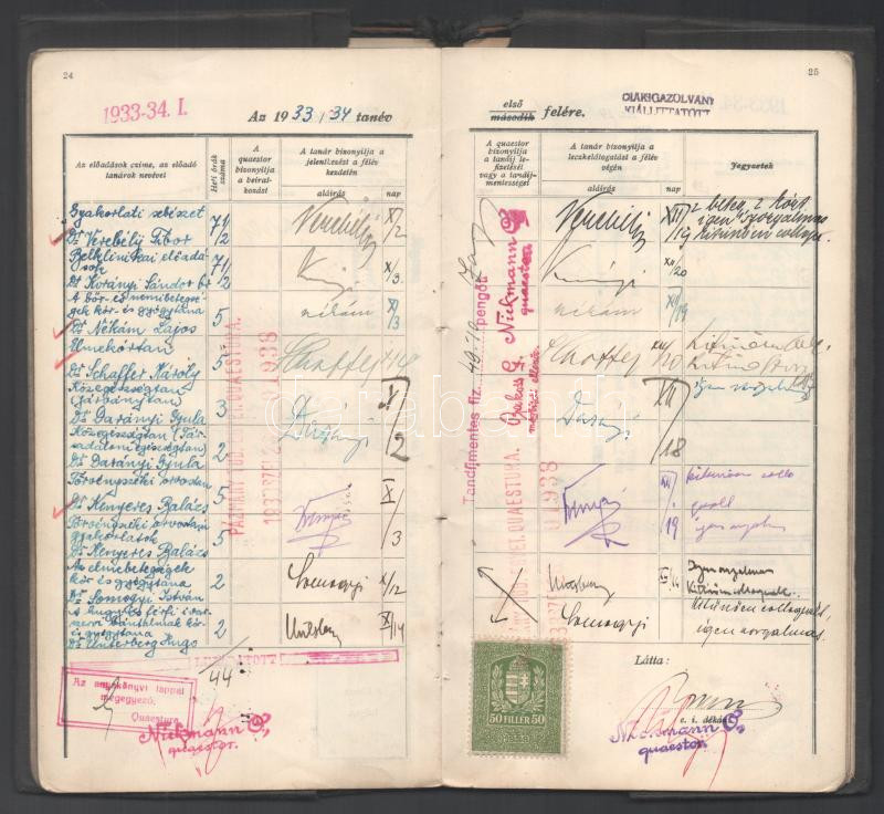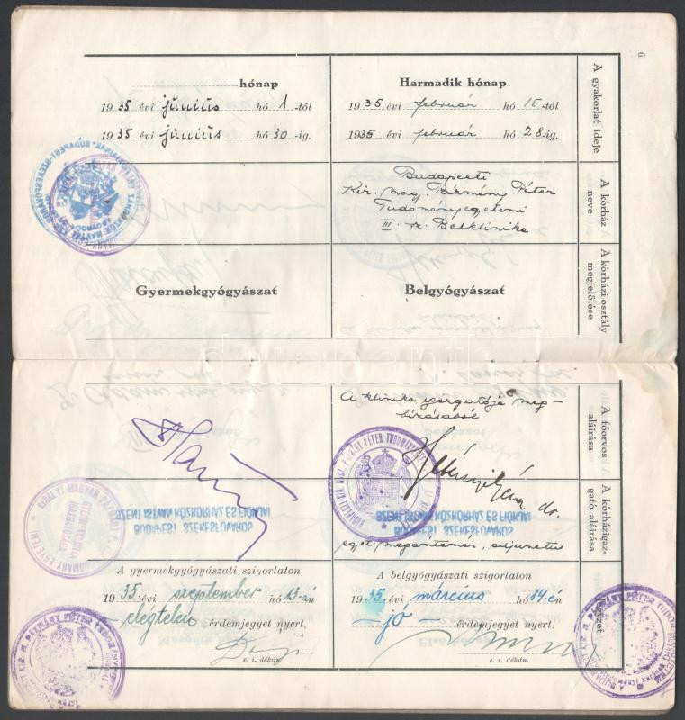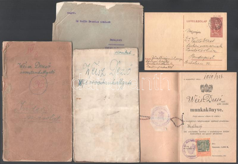 1921-1945 Valló (Weisz) Dezső izraelita orvos okmányai, 8 db, főreáliskolai tanulmányi értesítő, egyetemi leckekönyvei (számos neves tanár aláírásával), munkakönyve, testnevelési ellenőrzőkönyve, dunaszerdahelyi Főrabbiság levelezőlapja, és gépelt magánlevél a Budapesti Izraelita Hitközség Alapítványi Közkórházának fejléces papírján.