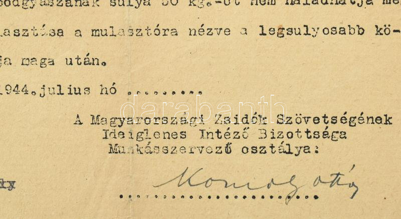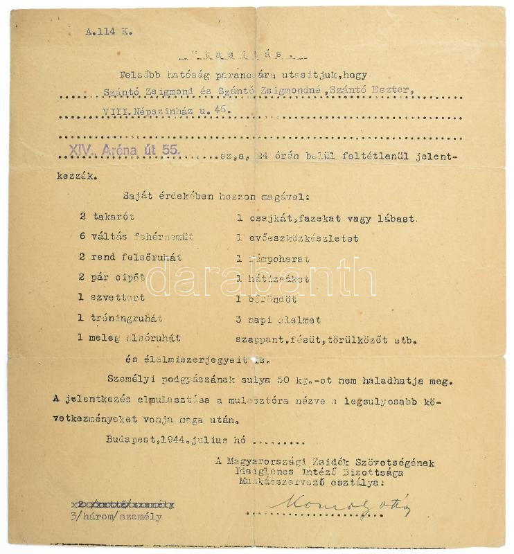 1944 Magyarországi Zsidók Szövetségének Ideiglenes Intéző Bizottsága Munkásszervező osztálya utasítása a XIV. ker Aréna út 55. szám alatt, a gyűjtőhelyen való megjelenésről, rajta az ajánlott értéktárgyak listájával. A hátoldalán a menlevél számaival. Az utasításon Komoly Ottó (1892-1945) autográf aláírásával.