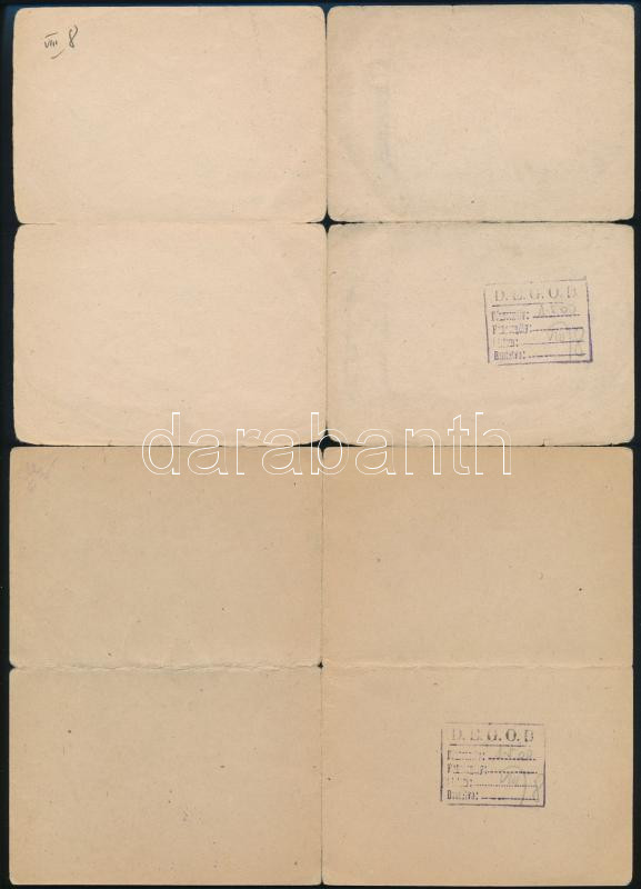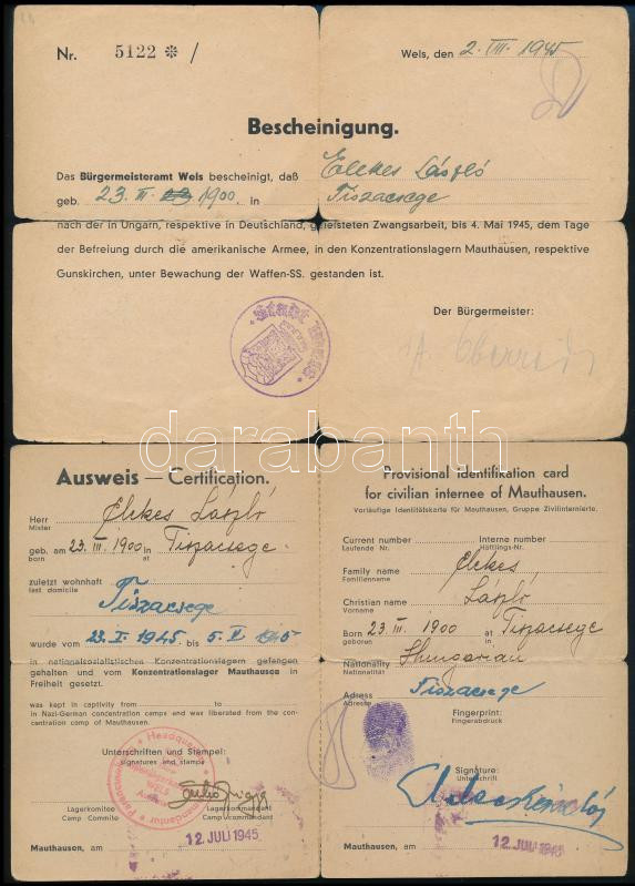 1945 Mauthauseni koncentrációs táborból szabadult magyar, tiszacsegei születésű személy, ideiglenes igazolványa, 1945. jul. 12., Ujjlenyomattal, angol és német nyelven. Valamint a felső-ausztriai Wels városának igazolása, hogy az illető az amerikai hadsereg felszabadításakor a mauthauseni, illetve gunskircheni táborok foglya volt a Waffen-SS őrizetében. Valamint egy igazolvány arról, hogy az illető a welsi Alpenjäger-laktanyában lévő gyűjtőtábor foglya volt, és annak elhagyásakor fertőtleníttetett. Változó állapotban, az egyik szakadt, kettőn DEGOB pecsétekkel.