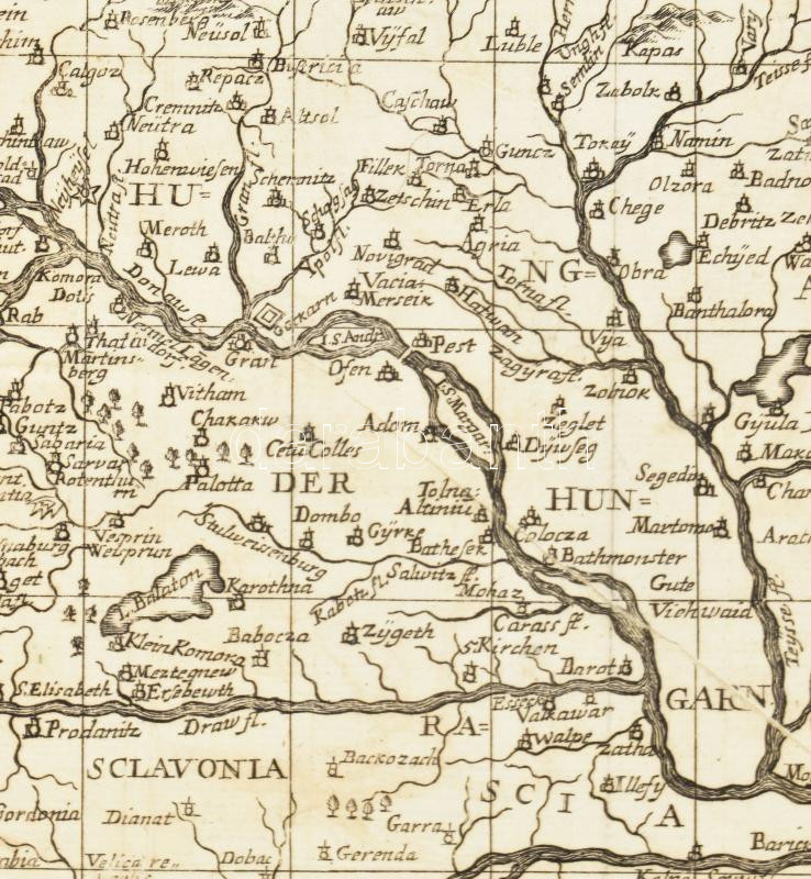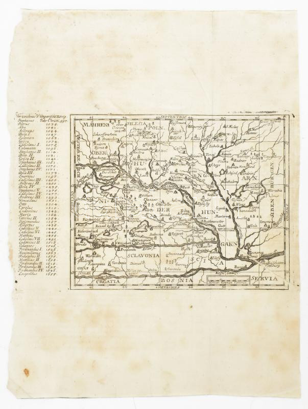 1684 A Magyar királyság térképe, valamint a magyar uralkodók felsorolása. Rézmetszet papírránccal. Megjelent: Wagner, Johann Christoph: Delineatio provinciarum Pannoniae et imperii Turcici... Augspurg, 1684. Jacob Koppmayer. / 1684 Map of Hungary and the list of the kings 220x140 mm