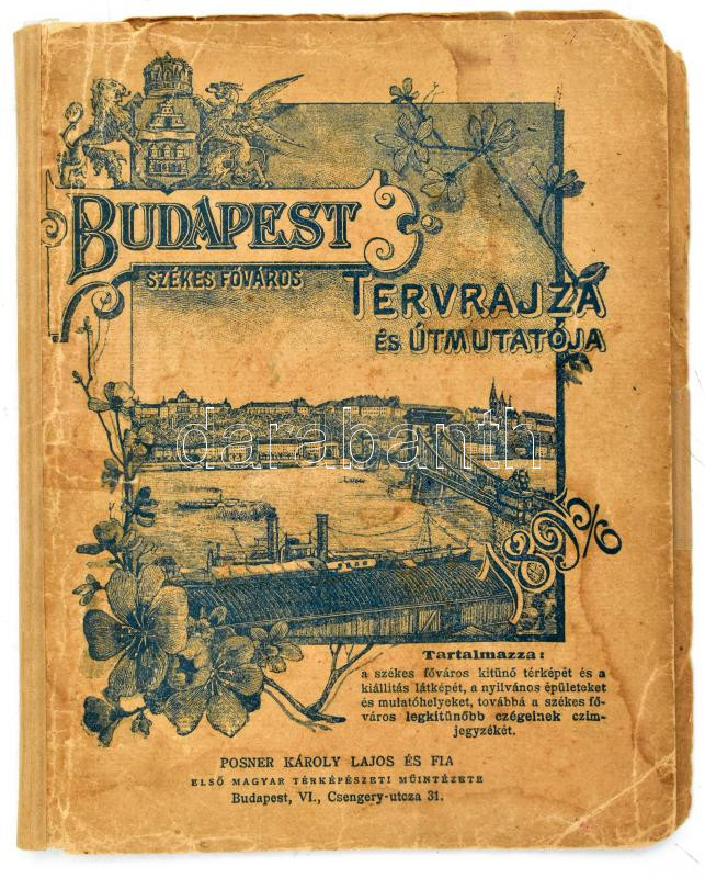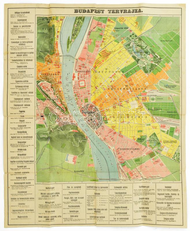 1896 Budapest Székesfőváros tervrajza, és útmutatója, a térkép hátoldalán az Ezredéves Országos Kiállítás látképével (Mirkovszky Géza (1855-1899)) Bp., Posner-ny, hajtott, a hajtások mentén kis szakadással, javított, foltos illusztrált kiadói borítékkal, térkép: 44,5x39,5 cm, látkép: 34x52 cm, teljes: 59x48,5 cm.