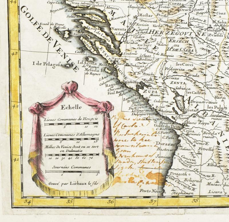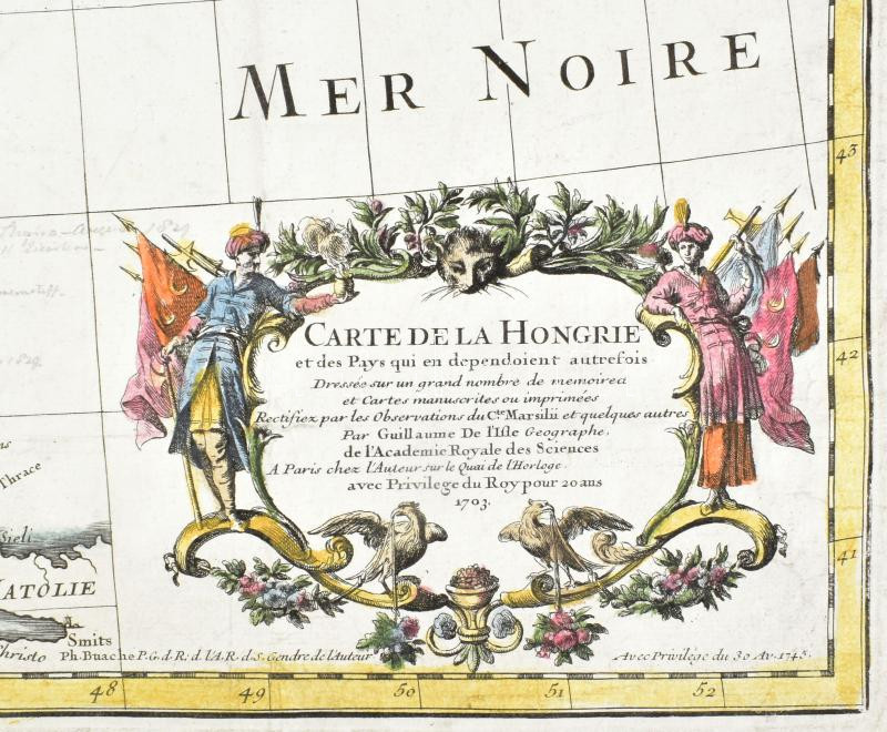 Magyarország és Erdély, valamint a környező részek korabeli határszínezésű, rézmetszetű térképe. Készítette Guillaume Delisle, metszette Liebaux le fils és Ch. Simonneau.