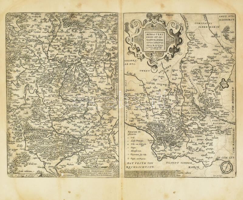 Franciae Orientalis: (Vulgo Franckenlant) descriptio auctore Sebasta Rotenhan / Monasteriensis Et Osnaburgensis Episcopatus Descriptio. Franciaroszág rézmetszetű térképe két részben. Megjelent, Ortelius, Abraham: Theatrum Orbis Terrarum., 1590. 505x360 mm Kis lyukkal / engraved map of France in two parts. With small hole.