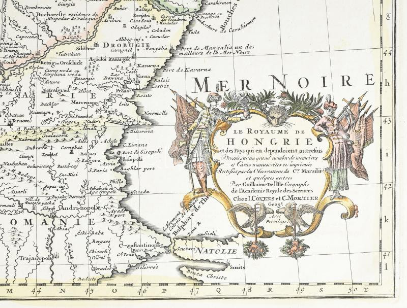 Le Royaume de Hongrie et des Pays qui en dependoient autrefois. Dressée sur un grand nombre de memoires et Cartes manuscrites ou imprimées. Rectifiez par les Observations du Cte. Marsilii et quelques autres. Par Guillaume De l'Isle Geographe de l'Academie Royale des Sciences Chez P. Mortier Geog. 1710. Avec Privilege.Színezett rézmetszet 490x580 mm.Felül térképet nem érintő beszakadással / engraved map of Hungary, Transylvania. With small tear on the upper part