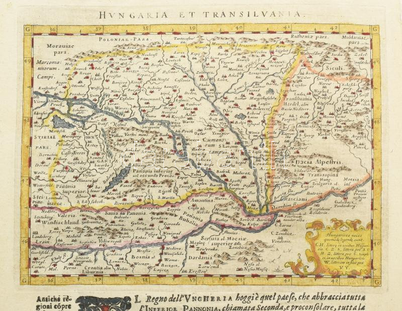 Magini, Giovanni Antonio: descrittione della Ungheria e della Transilvania. Megjelent: Geographie Universae... Venezia, 1596. Színezett rézmetszet, olasz nyelvű szöveggel. Térkép méret 173x125 mm, lapméret 21x29 cm Alul kissé foltos. / Engraved map of Hungary and Transylvania
