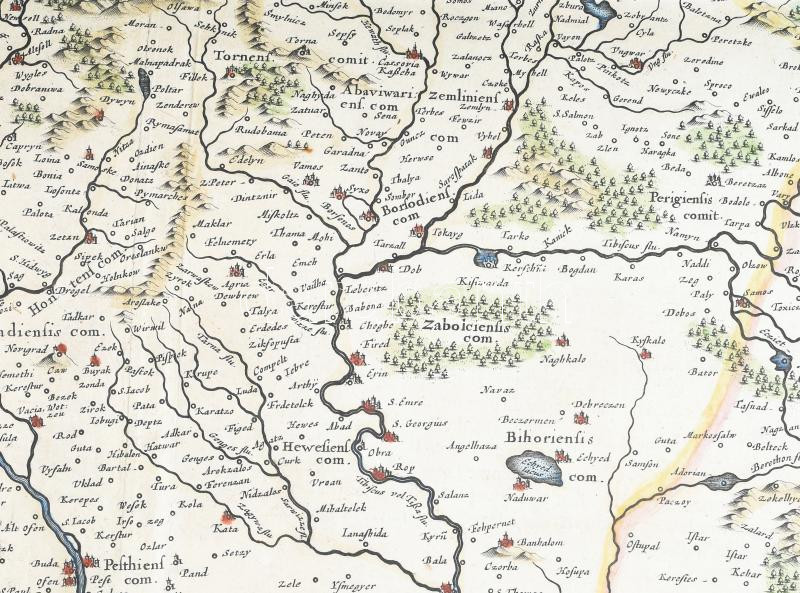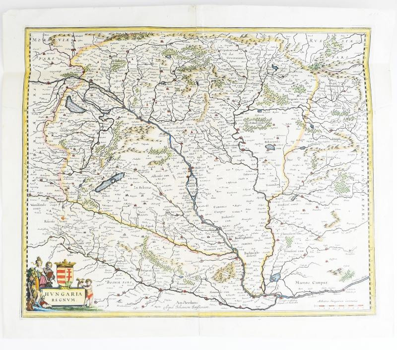 Willem Blaeu (1571-1638) / Johannes Jansonius (1729-1784) Hungaria Regnum. - Magyarország térképe, színezett rézmetszet, megj.: Hondius Appendix Atlantis oder der Welt Buchs. Amsterdam, 1636. 510x420 mm / Engraved map of the Kingdom of Hungary