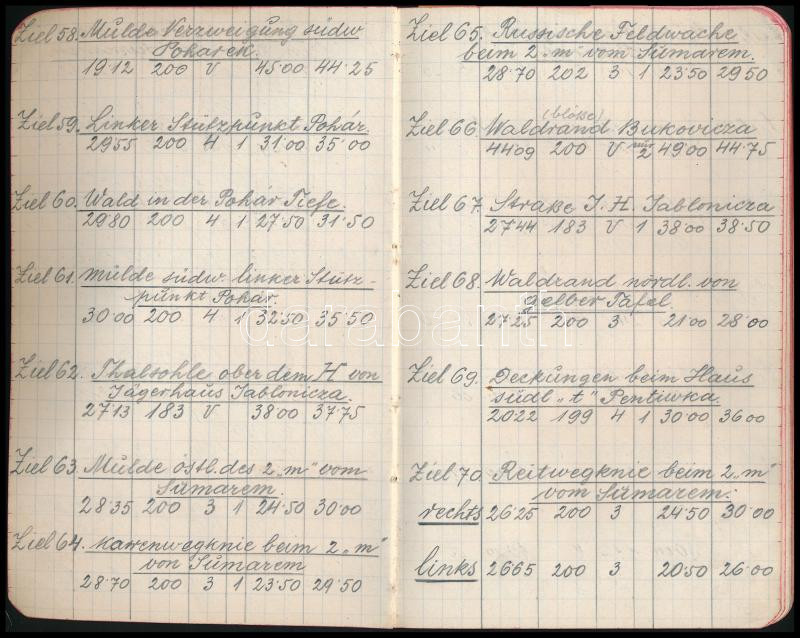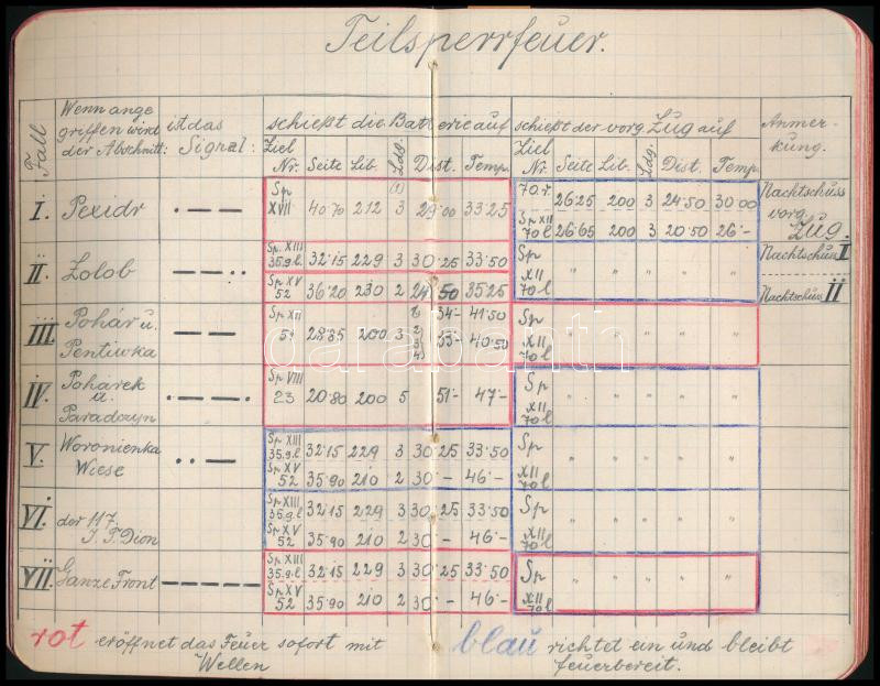 1916-1917 Dr. Szabó Béla hadnagy, a Cs. és Kir. Hadsereg 34. tábori tüzérezred 3. ütegénél szolgáló (ill. a háború alatt a 17. tábori ágyúsezrednél is megfordult) katonatiszt, tüzérségi megfigyelő naplója az I. világháború idejéből. Benne számos érdekes, főként német, kisebb részben magyar nyelvű feljegyzéssel: Jablonica (Jablánc, Felvidék) közelében található állásból végzett ágyúzások részletes felsorolása (számozott célpontok, megnevezéssel, koordinátákkal); tüzérségi zárótüzek táblázata; különböző jegyzékek (gázálarcok, orvosi és egyéb felszerelések, lóállomány, stb.); szolgálati beosztások; egyéb kapcsolódó feljegyzések. Összesen kb. 25-30 beírt oldal, megkímélt állapotú füzetben.