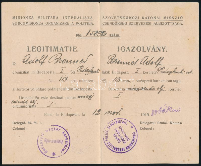 1919 Szövetségközi Katonai Misszió Csendőrség Szervezési Albizottságán... https://www.darabanth.com/de/41-Gross-Auktion/41.1/Kunst-Dokumente-andere-Sammelgebiete/Militaria~16790/1919-Szovetsegkozi-Katonai-Misszio-Csendorseg-Szervezesi-Albizottsaganak-igazolvanya-mueg~II2999048