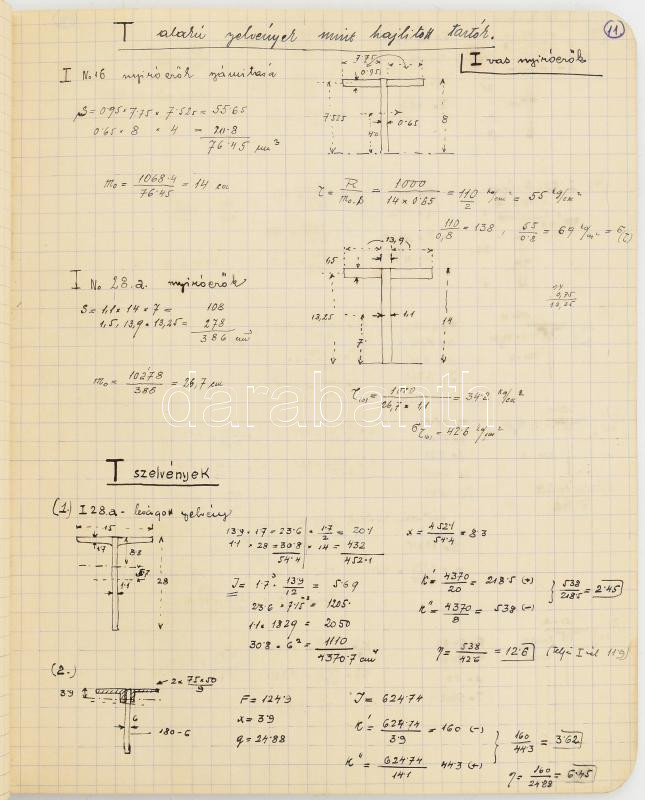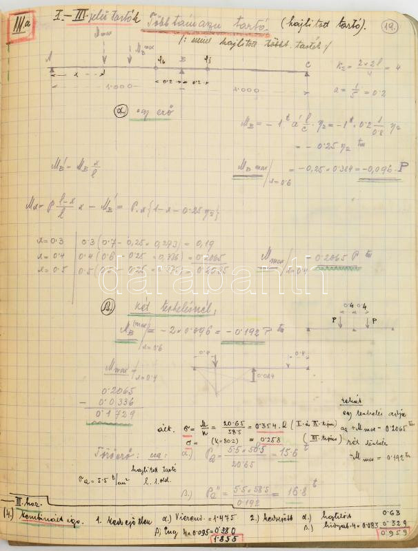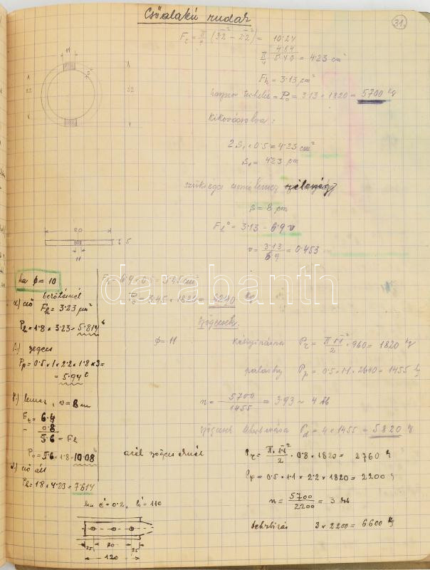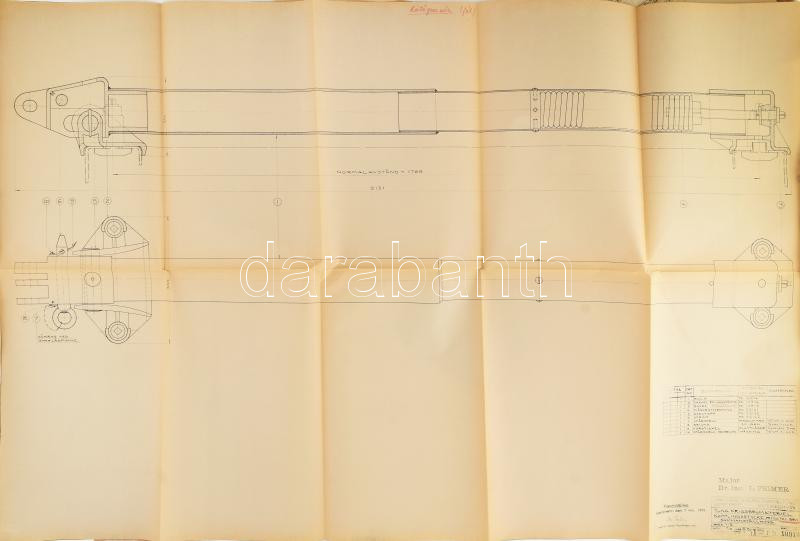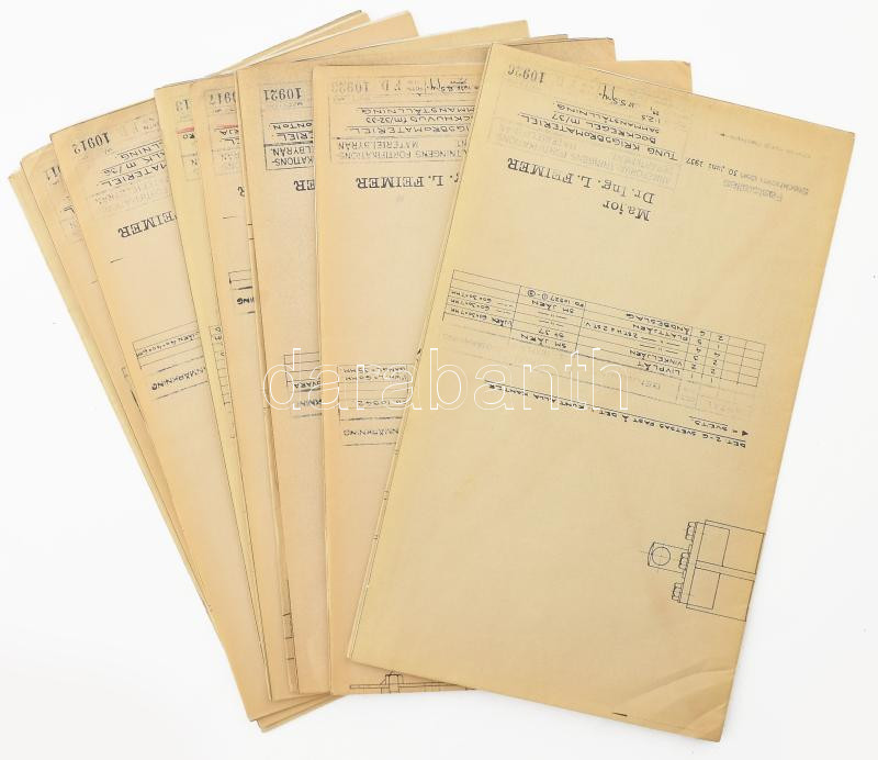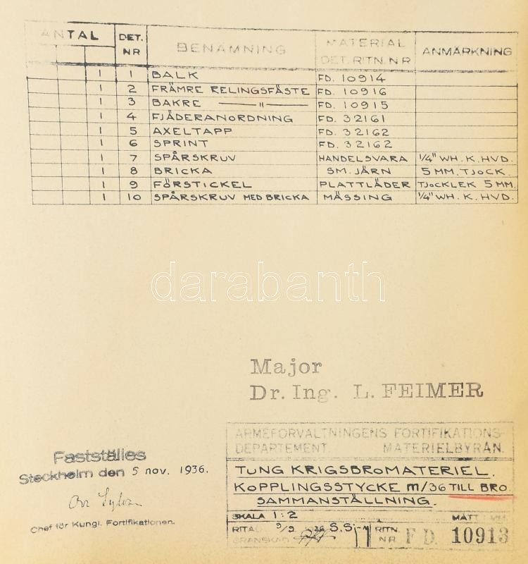1936-1937 Dr. Feimer László (1896-1954) hadiműszaki törzskari alezredes, hídtervező mérnök "K" hídjának (szétszedhető vasúti rácsos tartós híd) tervrajzai (36. M változat), a svéd hadsereg számára (svéd nyelven). 8 db nagyméretű tervrajz, jó állapotban, cca. 109x72 cm méretben. + 2 db füzet saját kezűleg írt jegyzeteivel (Kísérleti tartók számítása, I-II. füzet), feltehetőleg a műszaki egyetem tanulójaként töltött időszakából. (Feimer László a Budapesti József Nádor Műszaki Egyetemen szerzett mérnöki oklevelet 1923-ban, majd doktori címet 1928-ban. 1924-től 1941-ig a (kisebb-nagyobb megszakításokkal) M. Kir. Honvéd Haditechnikai Intézetnél dolgozott, ahol hmtk. alezredesi rangig jutott. Tudását több külföldi országban is kamatoztatni tudta, ahol szintén érdeklődéssel és elismeréssel fogadták szakmai eredményeit. Az általa tervezett, először 1929-ben rendszeresített "K" híd - bár eredetileg ideiglenes hídszerkezetnek épült - bizonyította, hogy akár több mint 40 éven keresztül képes hibátlanul (fél)állandó hídként funkcionálni. Tudományos kutatásainak eredményei, a maga idejében úttörőnek számító szakmai vívmányai a mai napig relevánsak a hadi hídépítészet területén.) / 1936-1937 Blueprints of the "K-bridge" military bridge (36. M variant), designed by László Feimer (1896-1954) bridge engineer, for the Swedish Military (in Swedish language). 8 pcs, in good condition, approx. 109x72 cm size. + 2 of his handwritten notebooks, likely from his time as a student of the Budapest University of Technology and Economics
