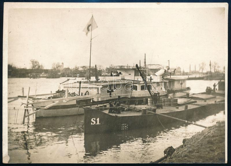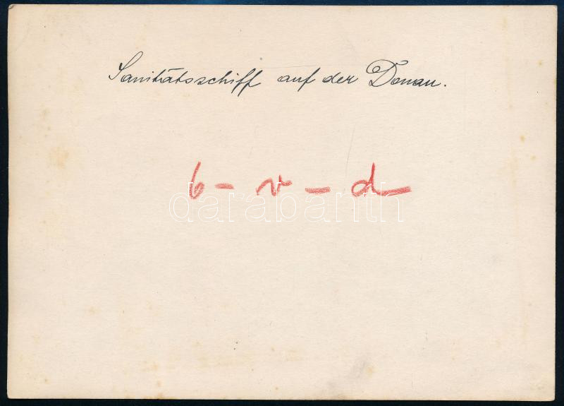 cca 1914-1918 Az Osztrák-Magyar Cs. és Kir. Dunaflottilla (K. u. k. Donauflottille) kórházhajója. Eredeti fotó, a hátoldalon feliratozva, egyik sarka kissé sérült, 17,5x12,5 cm / cca 1914-1918 Hospital ship of the Austro-Hungarian Danube Flotilla (K. u. k. Donauflottille). Original photo, with description on the back, slight damage on one corner, 17.5x12.5