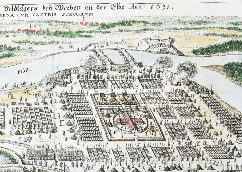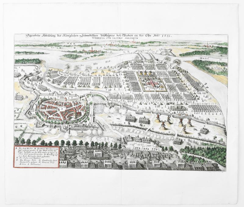 Merian, Matthäus: Eigentliche Abbildung des Königlichen Schwedischen Veldlagers bey Werben an der Elbe Anno 1631. A svéd csapatok Werbennél Színezett rézmetszet. restaurált / Colored engraving with fold mark