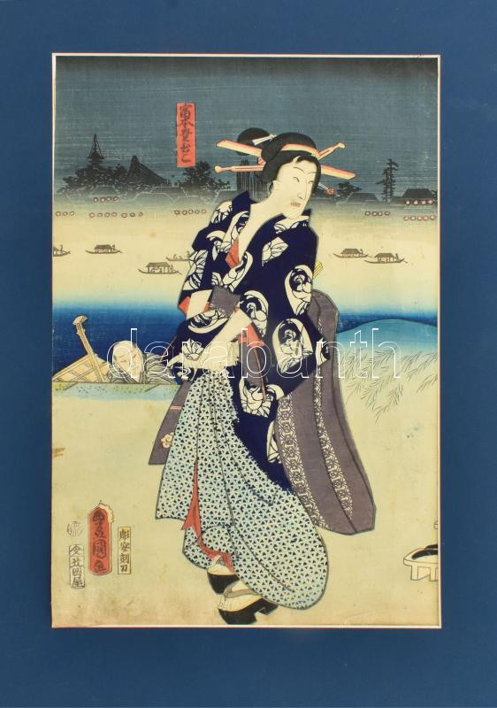 Utagawa Toyokuni (1769-1825): Hölgy kék kimonoban. Színes japán fametszet, papír, jelzett a metszeten. Apró sérülésekkel. Lap széle vágott. Paszpartuban. 35x24 cm. / Utagawa Toyokuni (1769-1825): Lady in blue dress. Japanese woodcut on paper, signed on the woodcut, with small damages. Cut. In passepartout. 35x24 cm