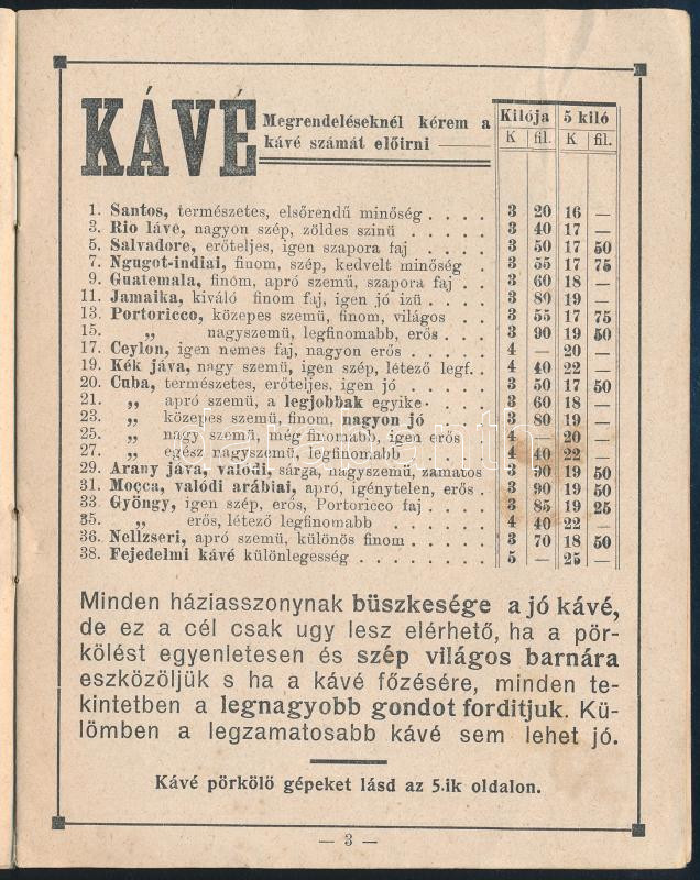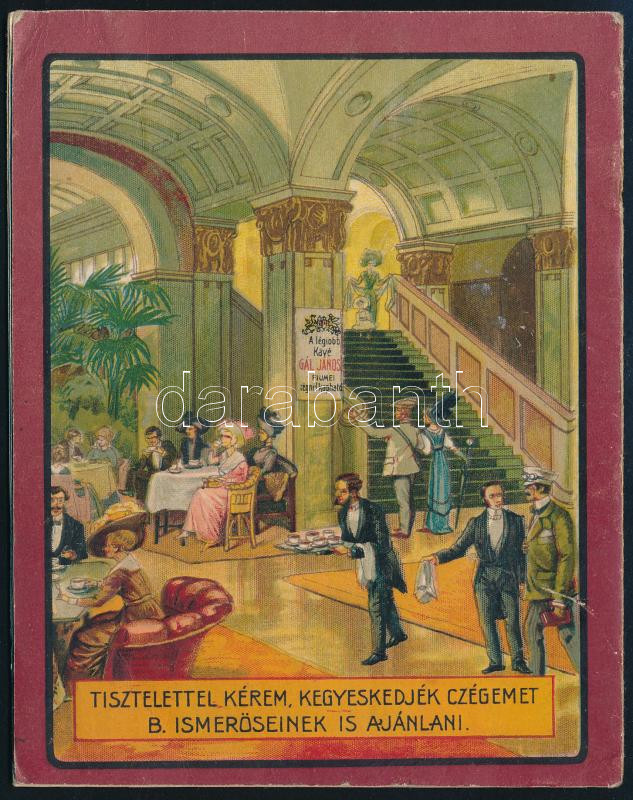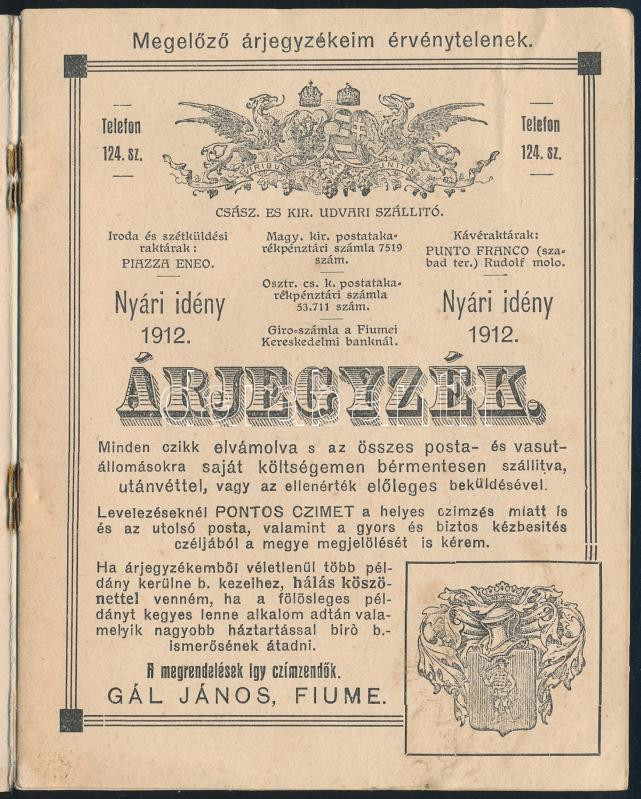 1912 Fiume, Gál János cs. és kir. udvari szálló árjegyzék. Gyarmatáru Értesítő 15. sz. 1912 nyári idény. 1912. jun. 1. Fiume, Első Magyar Kávé Beviteli Üzlet, 16 p. Benne kávé, tea, rum, csokoládé, bor és más termékekkel. Díszes színes litografált borítójú papírkötésben, a borítón kis kopásnyomokkal, a füzetke elvált a borítótól, de alapvetően jó állapotban, 15x12 cm