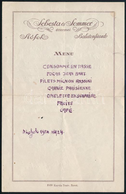 1924 Sebesta és Sommer siófoki éttermének menükártyája, 1924. VIII. 24... https://www.darabanth.com/de/41-Gross-Auktion/41.1/Kunst-Dokumente-andere-Sammelgebiete/Werbungen~16787/1924-Sebesta-es-Sommer-siofoki-ettermenek-menukartyaja-1924-VIII-24-a-hatoldalan-ceruz~II2999351