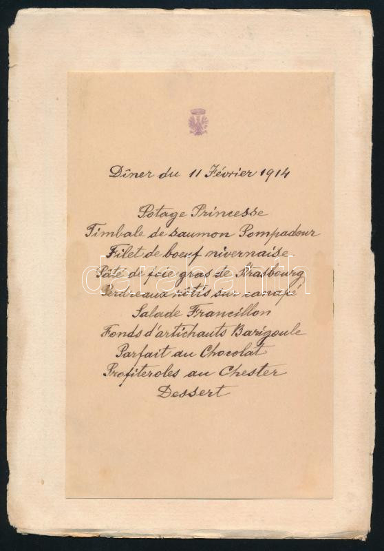 2 db menükártya: cca 1900 Temesvár, Hotel Prince Royal díszesen illusztrált francia ny. menükártyája, jobb alsó sarkában kissé sérült, 21x11 cm + 1909 Palais Sinaia, a Peles kastély látképével illusztrált francia ny. menükártya, jobb felső sarkában apró sérüléssel, hátoldalához egy másik kézzel írt menü rögzítve, 19x9 cm / 2 menu cards, one of them Timisoara Hotel Prince Royal, the other 1909 Palais Sinaia, with illustration of castle Peles