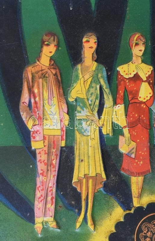 cca 1930? Gönczi-Gebhardt Tibor (1902-1994): Filtex Sevilla kelmereklám, litografált, dombornyomott fém reklámtábla, [Bp.], Buchsteiner és Fia, jelzett (Gebhardt de felette és alatta a jelzés olvashatatlan), körbevágott, kopott, 47x31 cm