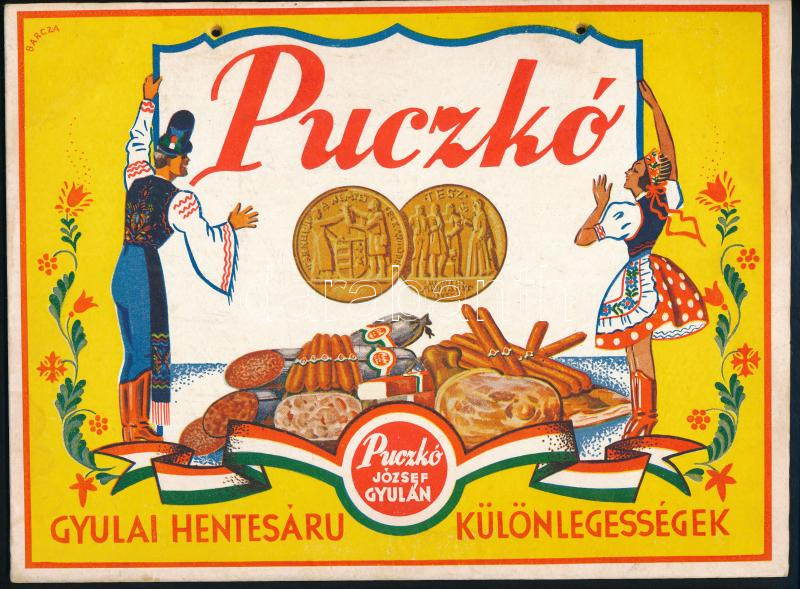 cca 1936 Puczkó József gyulai hentes kiakasztható art deco karton rekl... https://www.darabanth.com/de/41-Gross-Auktion/41.1/Kunst-Dokumente-andere-Sammelgebiete/Werbungen~16787/cca-1936-Puczko-Jozsef-gyulai-hentes-kiakaszthato-art-deco-karton-reklamtablaja-szep-allapo~II3002223