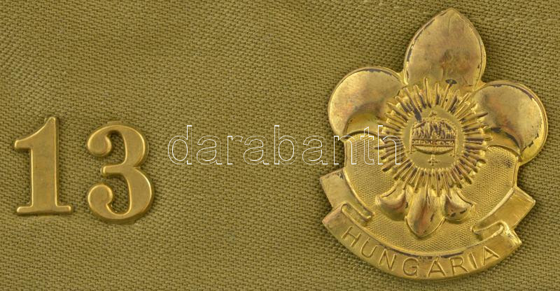 ~1930-1940. Cserkész parafernália tétel: cserkész sapka rajta "Hungária" aranyozott cserkész lemez sapkajelvény, koronás-liliomos aranyozott lemez cserkészjelvény, "13"-as szám és két cserkész gomb T:UNC,AU