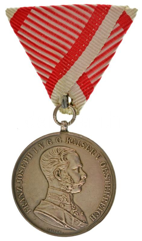 ~1870. "Ferenc József I. osztályú Ezüst Vitézségi Érem" peremén jelzett Ag kitüntetés modern mellszalagon. Szign.:Leisek T:XF