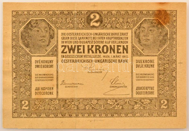 1917. 2K fekete hátlapi fázisnyomat, látható illesztőkereszttel T:XF fo. / Austro-Hungarian Monarchy 1917. 2 Korona black phase print with visible printing frame C:XF spotted