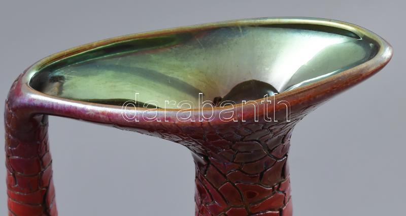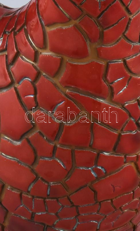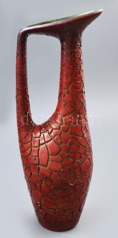 Zsolnay díszváza. Savmaratott és repesztett felületén ökörvér színű eozin mázzal festett, cca 1960, terv.: Törzsök Piroska. Kis mozaikdarab-hiánnyal, alján jelzett, m: 31,5 cm