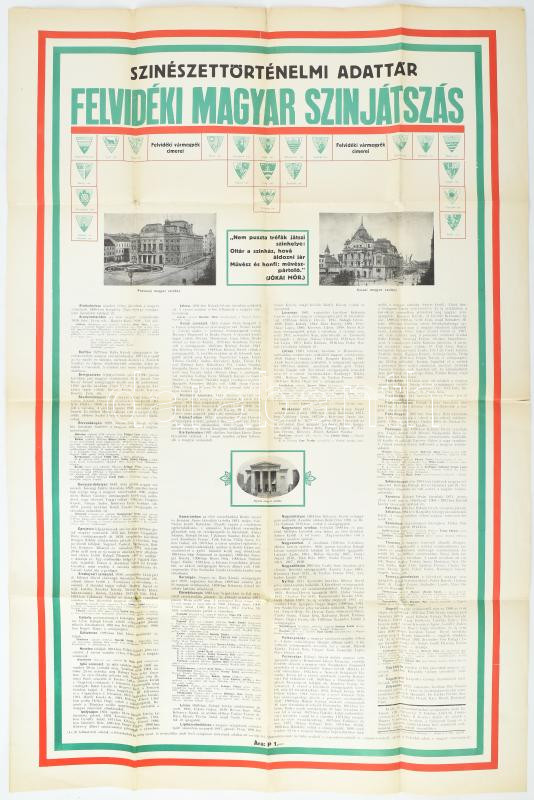 Beschreibung: 1938 Színészettörténelmi adattár. Felvidéki magyar színjátszás. Felvidéki vármegyék címerével, fekete-fehér fotókkal illusztrált nagyméretű propaganda plakát, Bp., Elbert és Társa-ny., hajtott, 94x63 cm