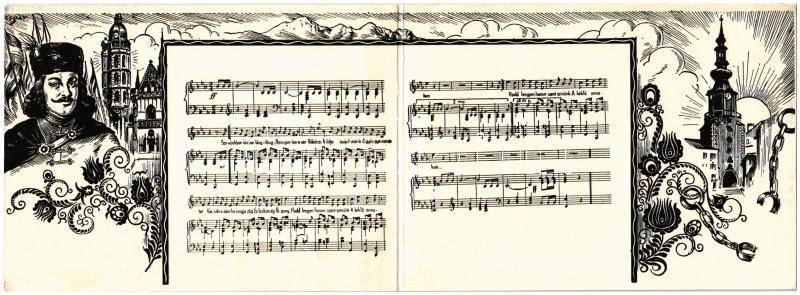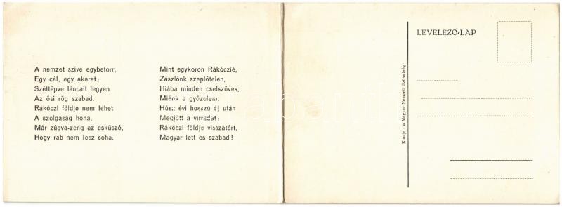 1940 Rákóczi Ferenc induló kottával. Kihajtható képeslap. Magyar Nemzeti Szövetség kiadása / Hungarian irredenta marching song with music sheet, irredenta propaganda, foldable card s: Zsolt (EK)