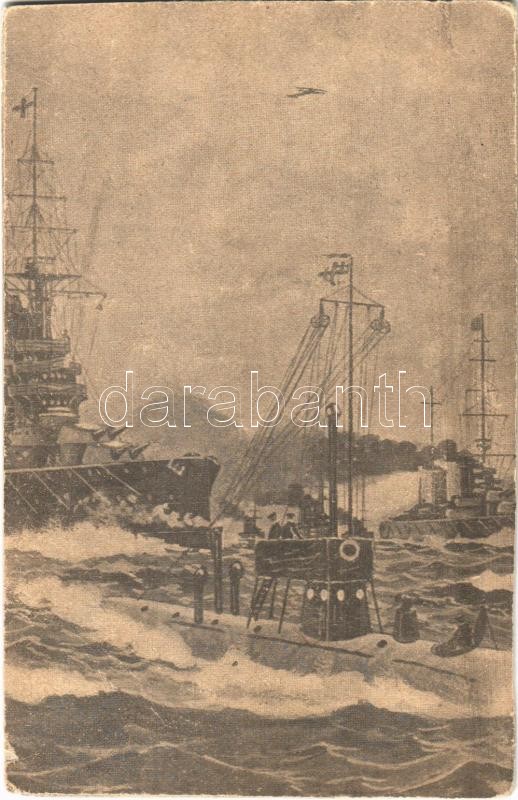 1928 Italian art postcard, submarine and battleships (vágott / cut) https://www.darabanth.com/de/410-Fernauktion/410.0/Ansichtskarten/Kriegsschiffe~1500024/1928-Italian-art-postcard-submarine-and-battleships-vagott-cut~II2386471