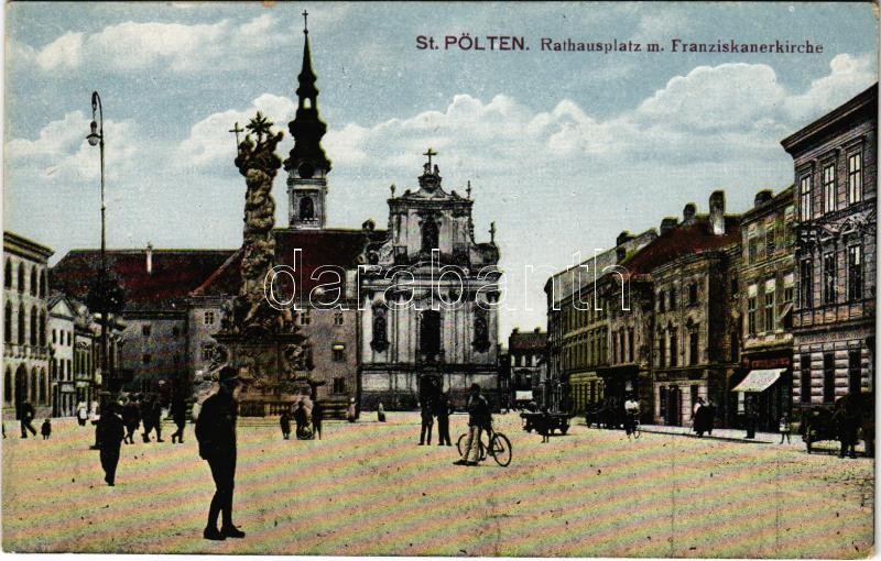 Beschreibung: Sankt Pölten, Rathausplatz m. Franziskanerkirche / town hall, square, church