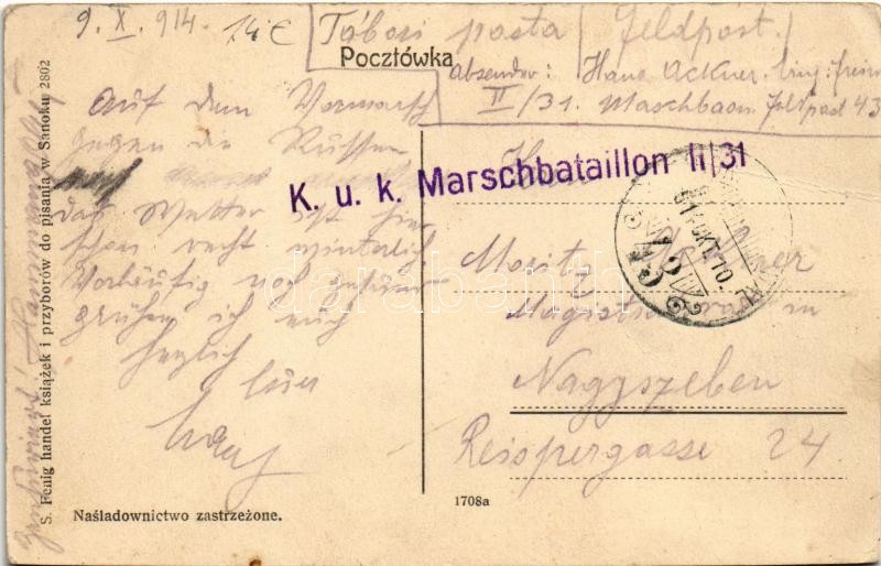 Beschreibung: 1914 Sanok, Ul. Kosciuszki, Michal Stefanski, B. Liebermann / street view, shops (surface damage) + "K.u.k. Marschbataillon II/31."