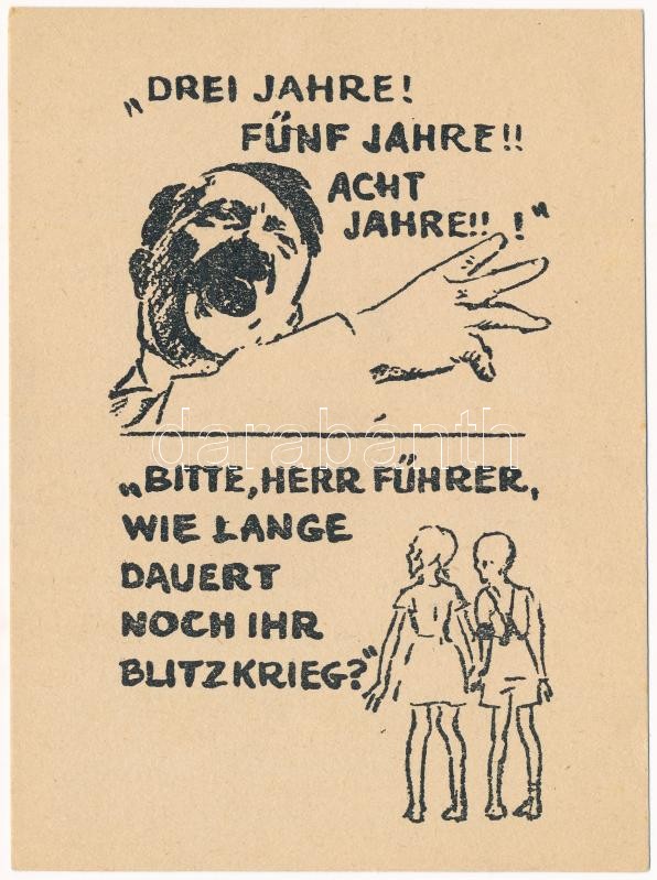 Drei Jahre! Fünf Jahre! Acht Jahre! Bitte, Herr Führer, wie lange dauert noch Ihr Blitzkrieg? / Német második világháború ellenes propaganda lap Hitlerrel / Adolf Hitler. WWII German anti-war propaganda card